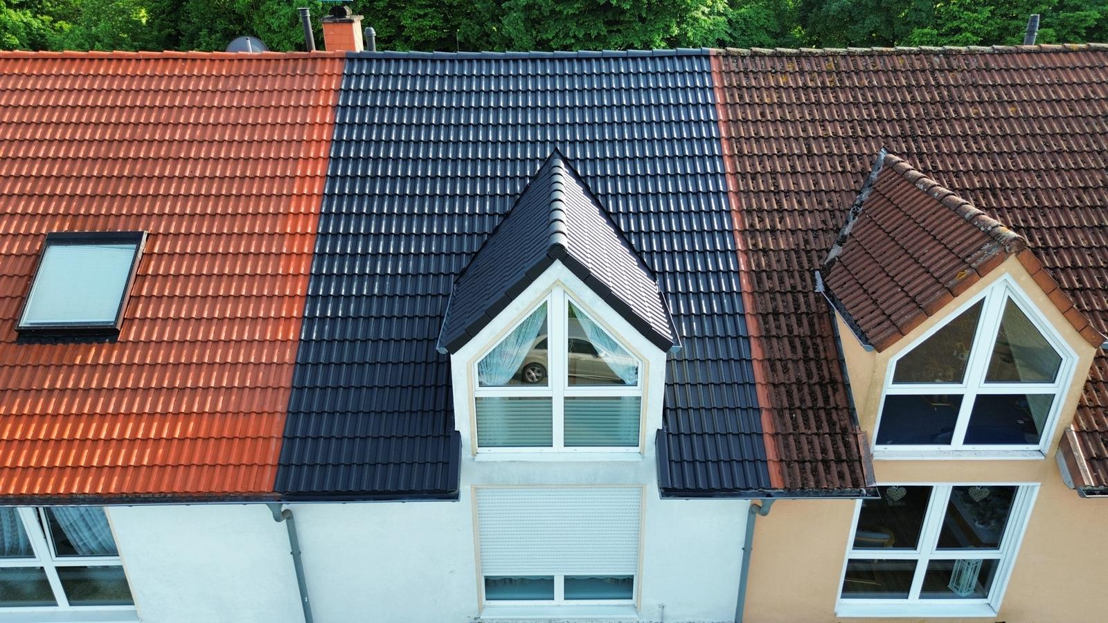 Ihr Dach präsentiert sich in neuem Glanz und ist langfristig geschützt. Die Beschichtung versiegelt die Poren der Dachpfannen, ohne die notwendige Atmungsaktivität zu beeinträchtigen. Schmutz, Pollen und Mikroorganismen können sich nicht mehr festsetzen und verlieren ihre Lebensgrundlage. Die Oberfläche wird spürbar glatter und stark wasserabweisend. Dank des Silikonanteils verteilt sich das Regenwasser gleichmäßig über die Dachfläche und unterstützt die natürliche Selbstreinigung. Feuchtigkeit hat keine Möglichkeit mehr, in die Dachpfannen oder die Unterkonstruktion einzudringen. So wird Ihr Dach dauerhaft vor Witterungseinflüssen geschützt, die Lebensdauer der Eindeckung deutlich verlängert und der Wert Ihrer Immobilie nachhaltig gesteigert.
