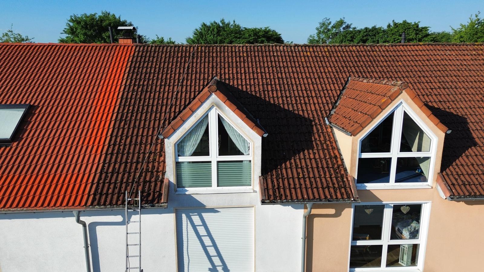 Wichtig: Eine Reinigung allein reicht meist nicht aus, da die Poren der Dachziegel offen bleiben. Nach 3–4 Monaten können Moose und Algen erneut aggressiv wachsen. Deshalb ist anschließend eine Beschichtung unerlässlich, um dauerhaften Schutz zu gewährleisten.